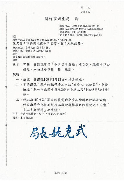 新竹市衛生局核准(手工香皂製造)